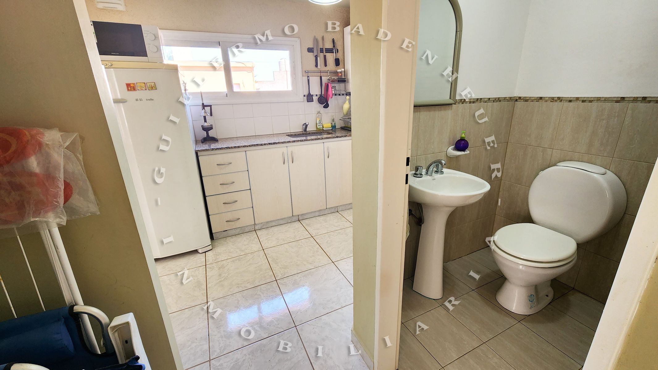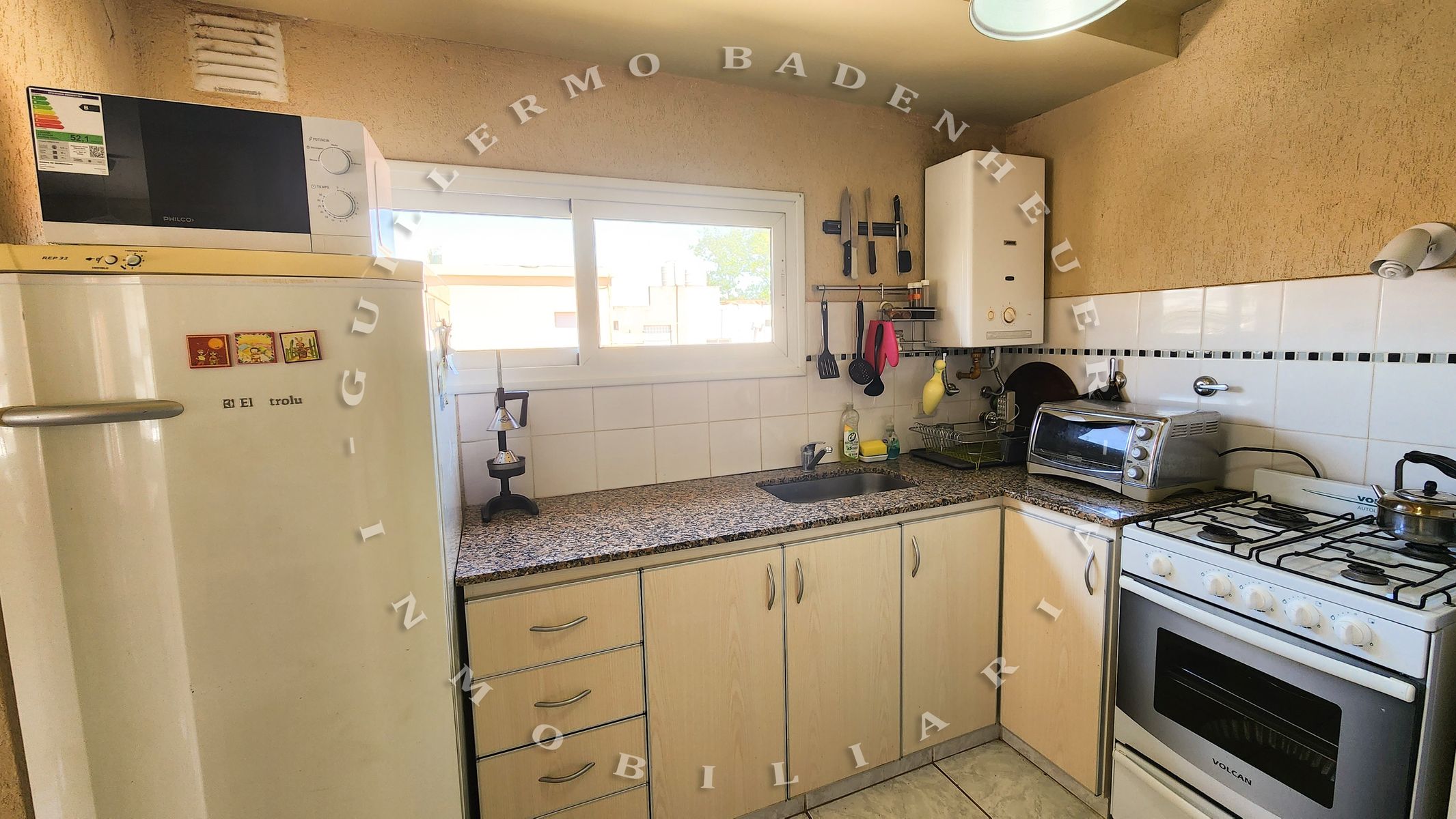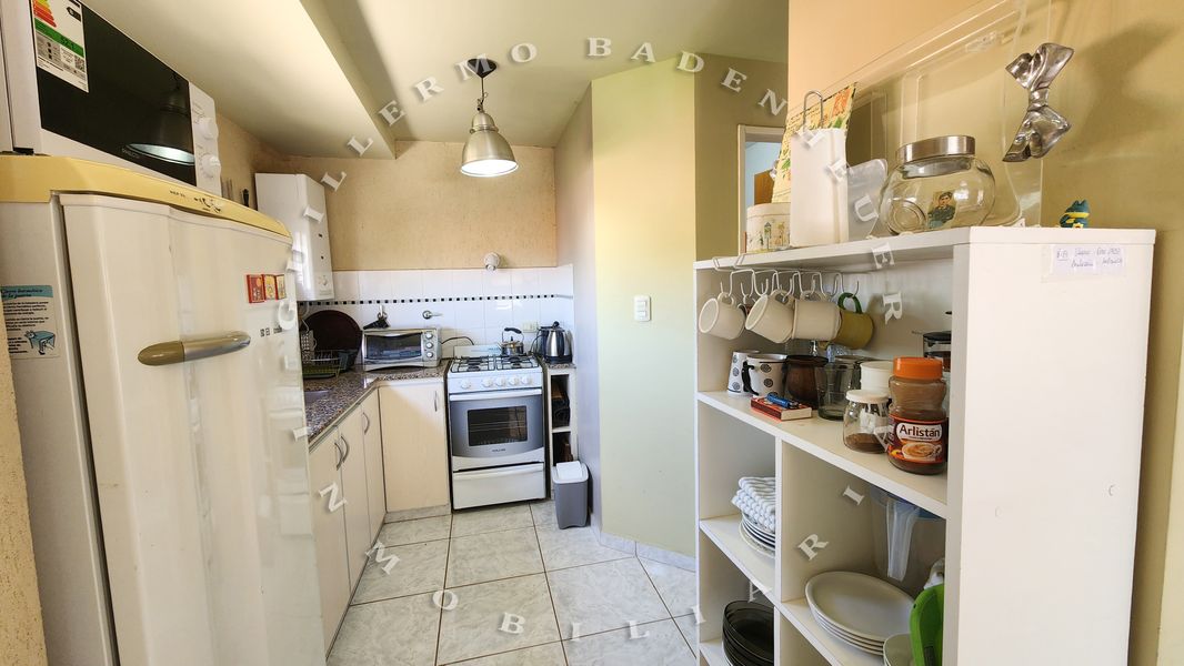 Cocina completa con heladera, microondas, horno, vajilla y todos los utensilios necesarios.
