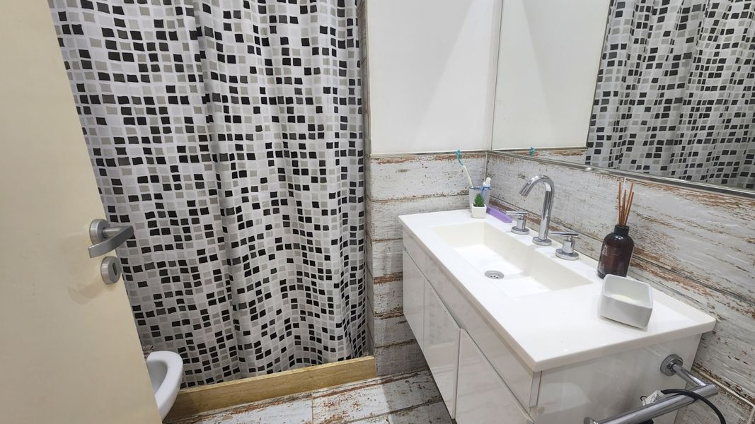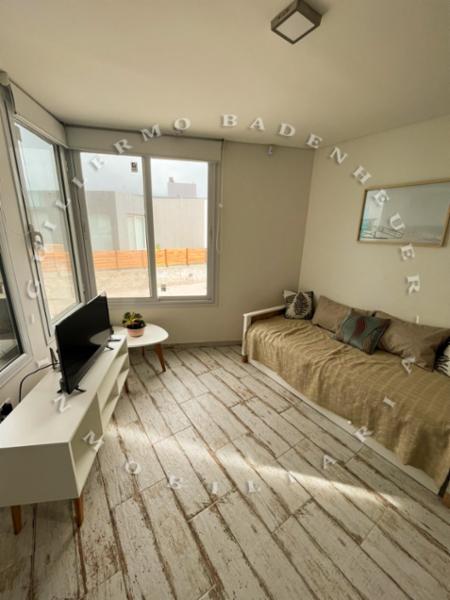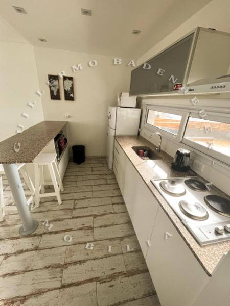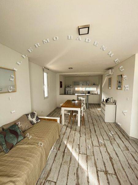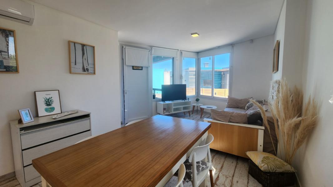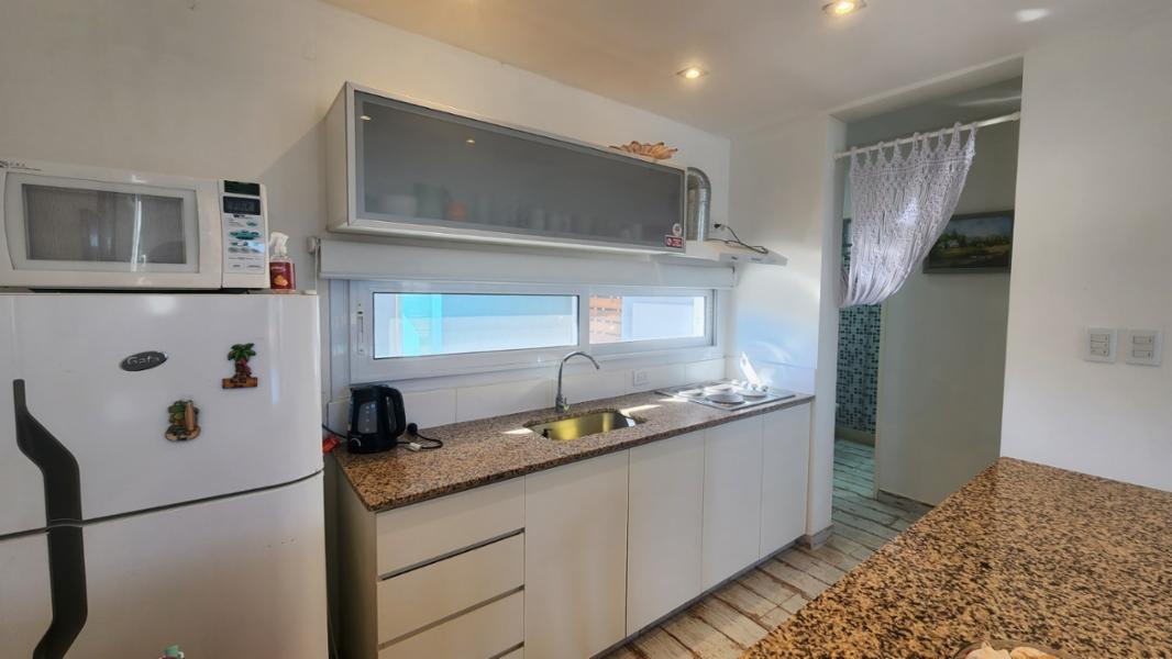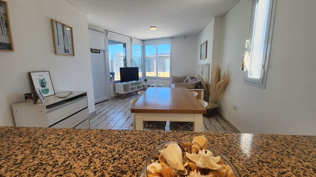 El departamento ofrece una entrada al living/comedor de concepto abierto donde se encuentra una cama marinera con otra cama abajo donde esta el aire acondicionado, wifi y televisor. La cocina posee una heladera con freezer, microondas, horno electrico, pava eléctrica y tostadora junto con los distintos materiales de cocina.