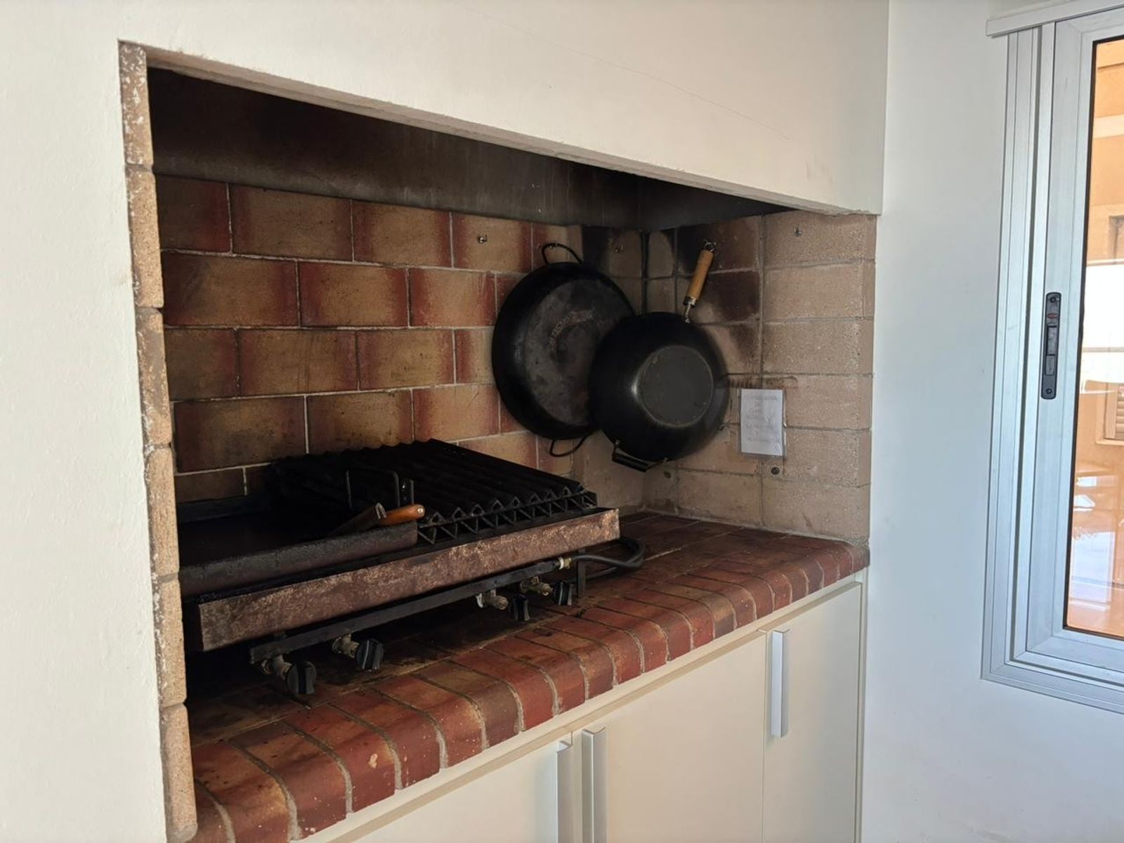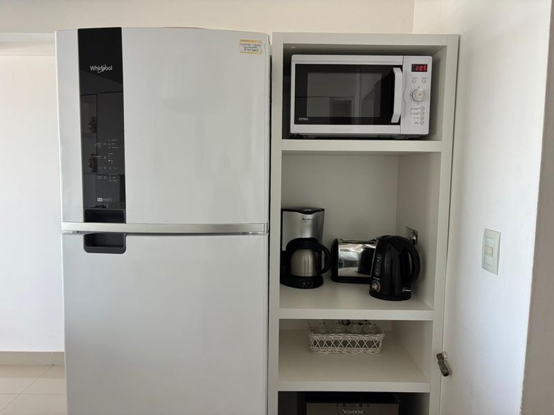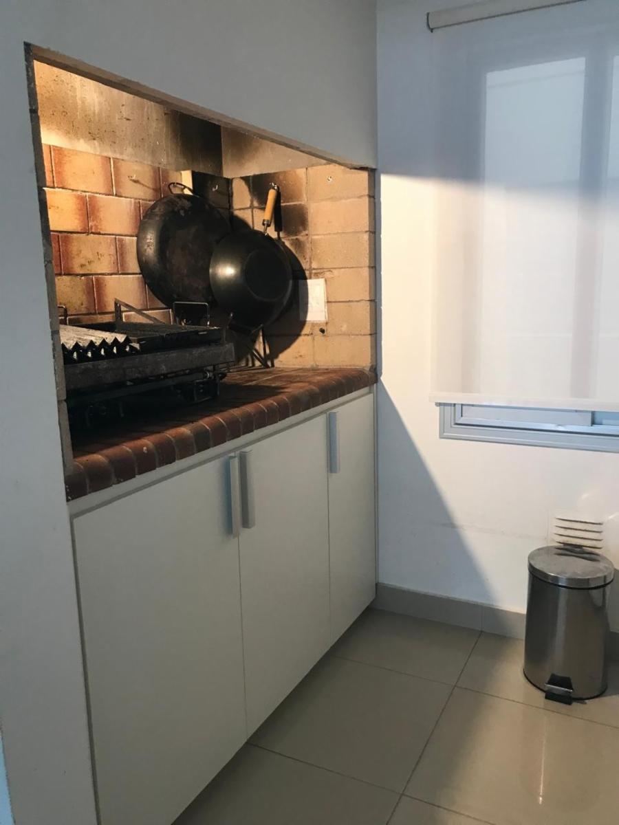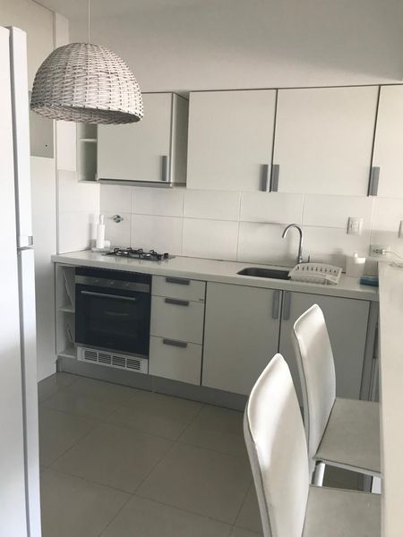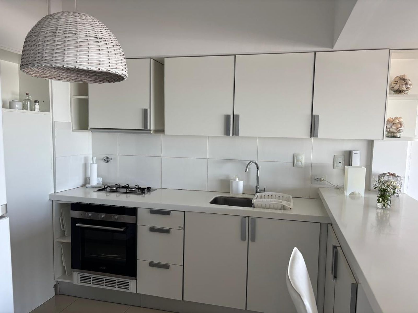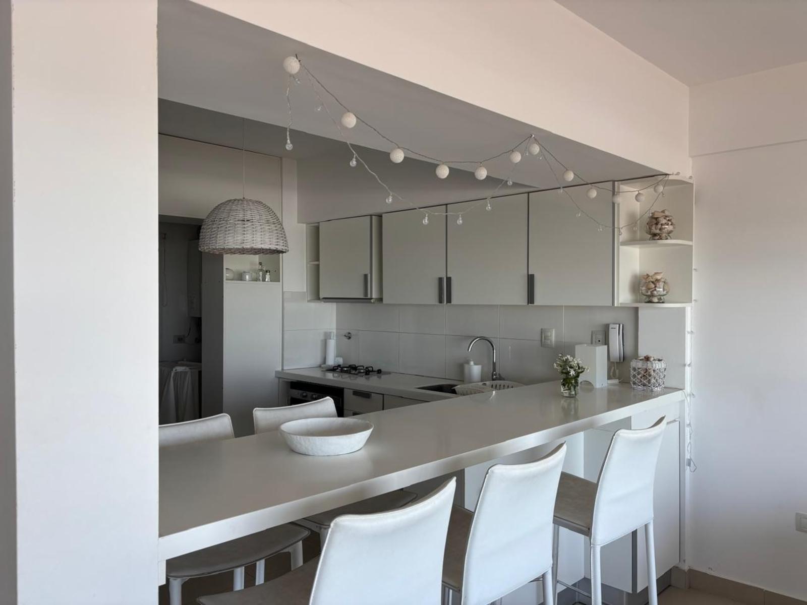 Cocina integrada de diseño, con barra desayunadora, electrodomésticos modernos, vajilla completa y detalles decorativos que suman calidez, lavadero y parrilla interna.