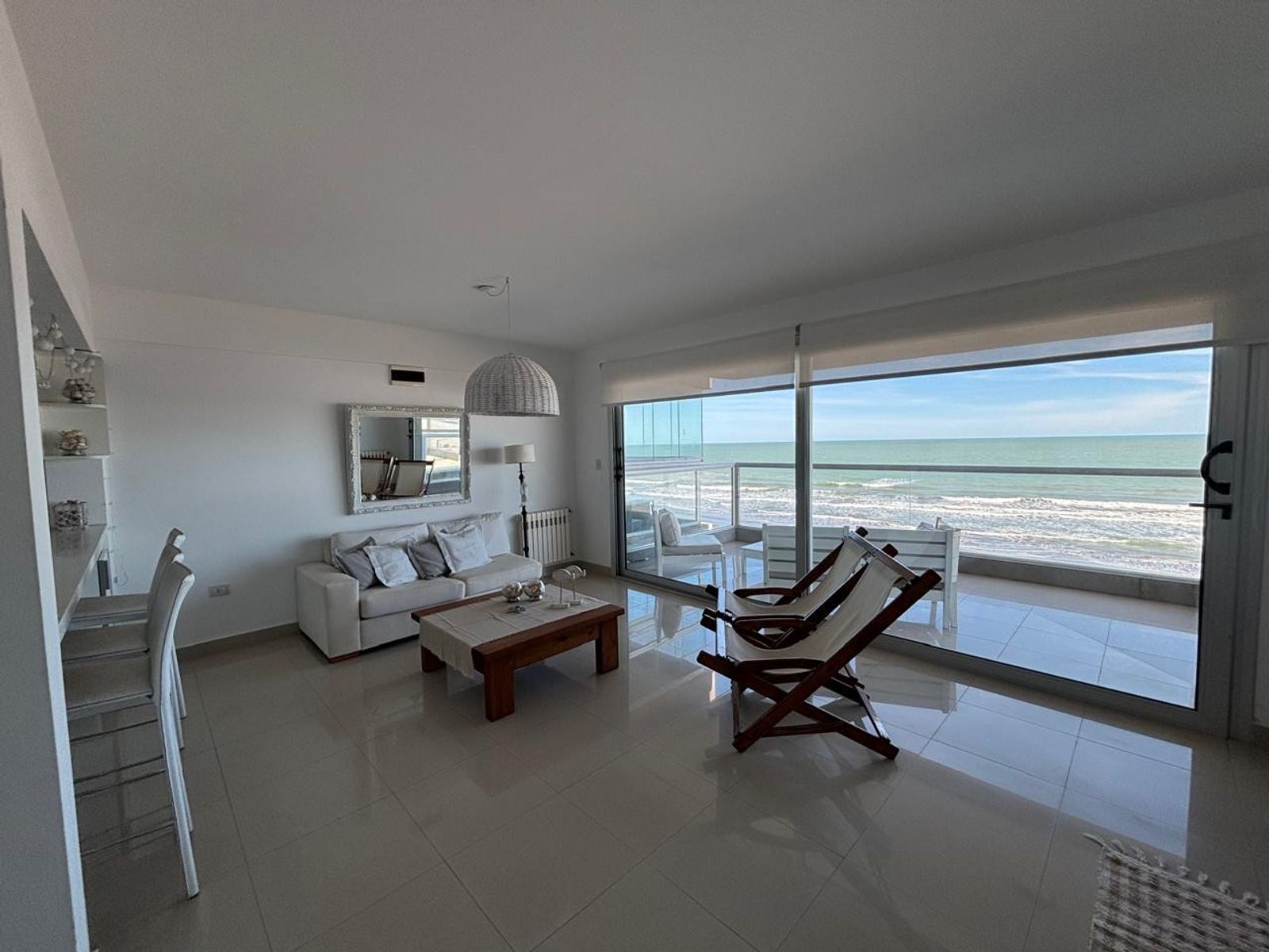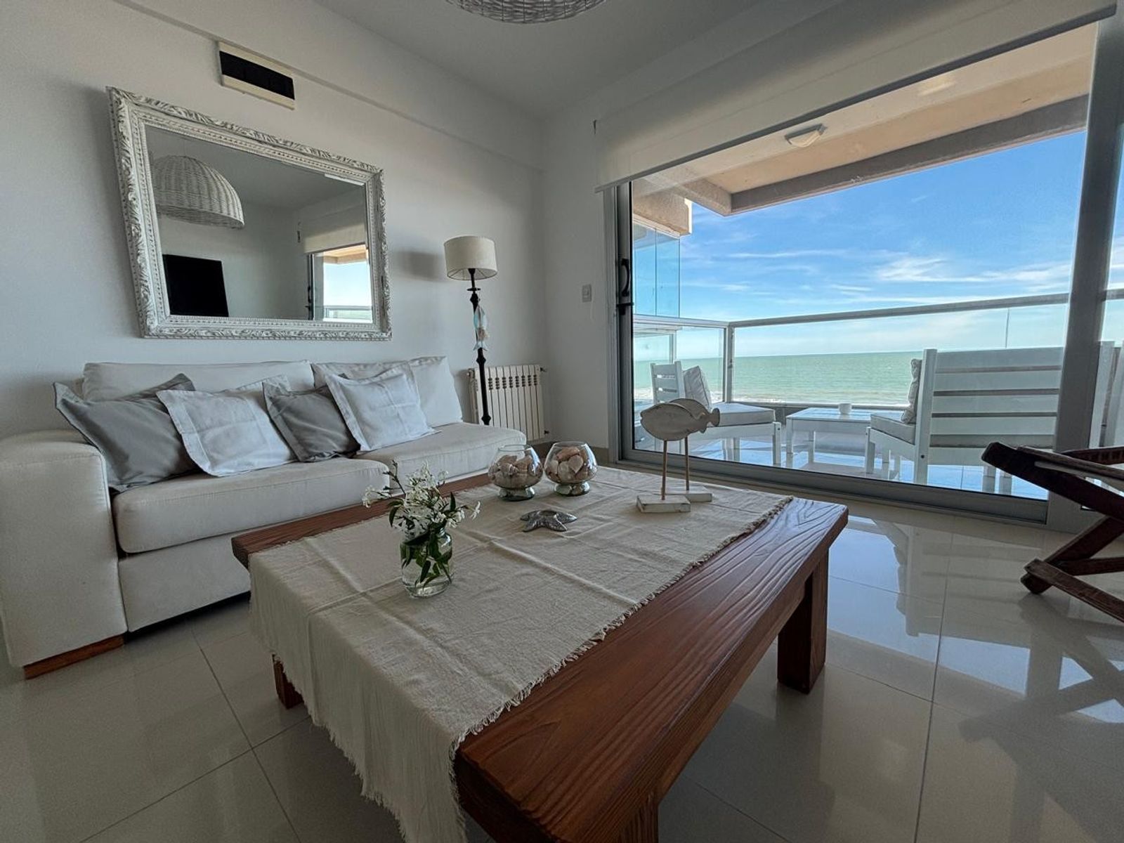 Living amplio y luminoso, con decoración minimalista y detalles náuticos. Sofá cómodo, espejo decorativo, mesa de centro y acceso directo al balcón con vista al océano.