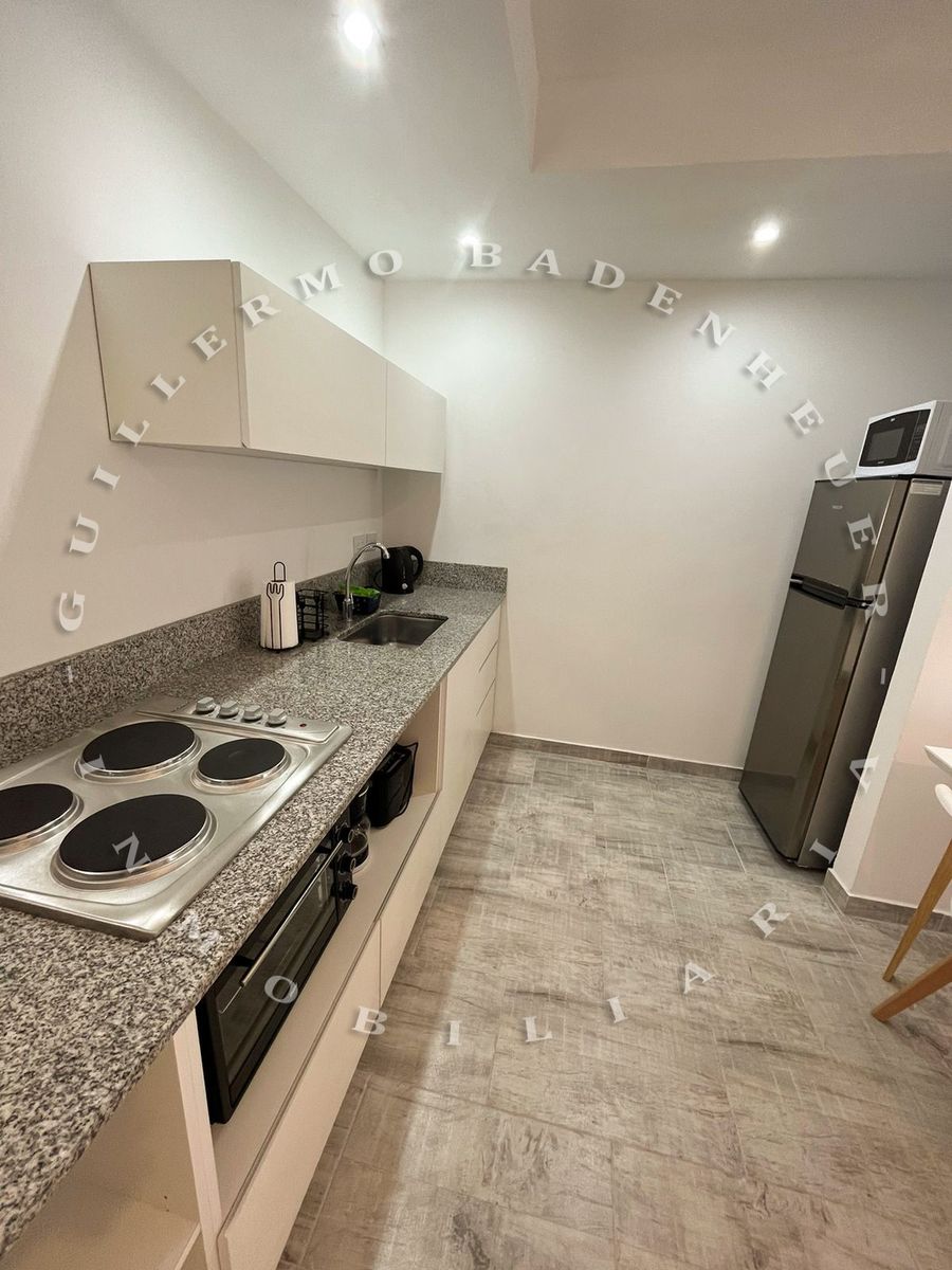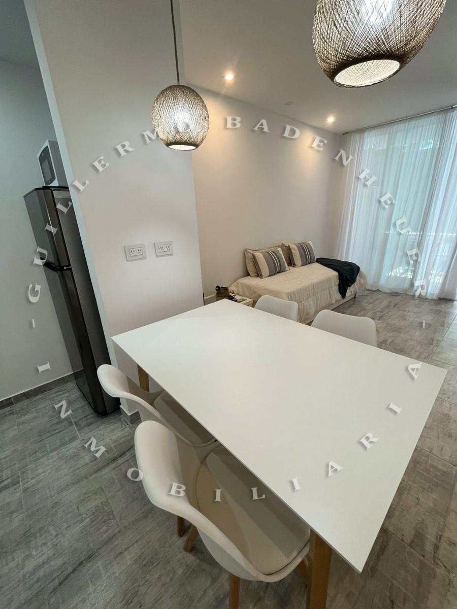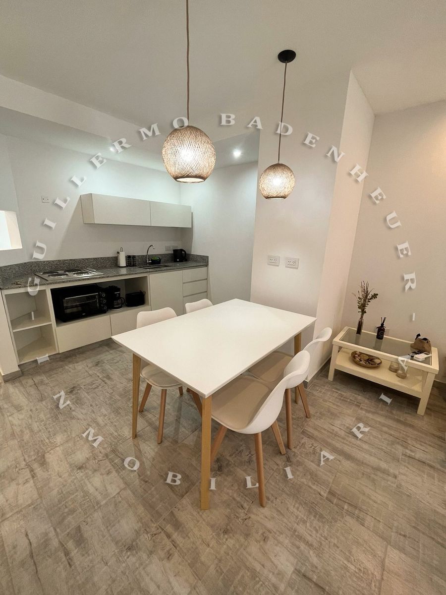 El departamento ofrece una entrada al living/comedor de concepto abierto donde se encuentra una cama marinera con otra cama abajo donde esta el aire acondicionado, wifi y televisor. La cocina posee una heladera con freezer, microondas y horno eléctrico, pava eléctrica, cafetera, tostadora junto con los distintos materiales de cocina.