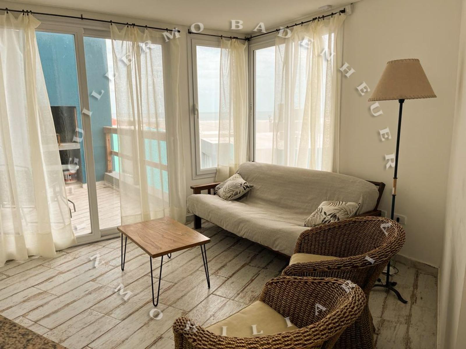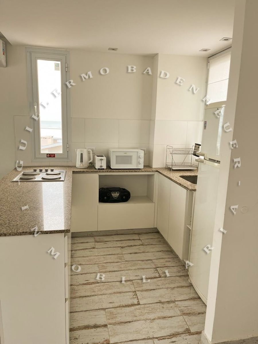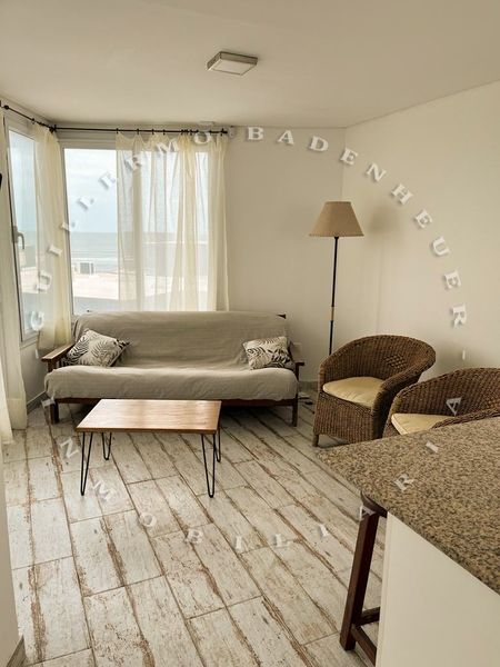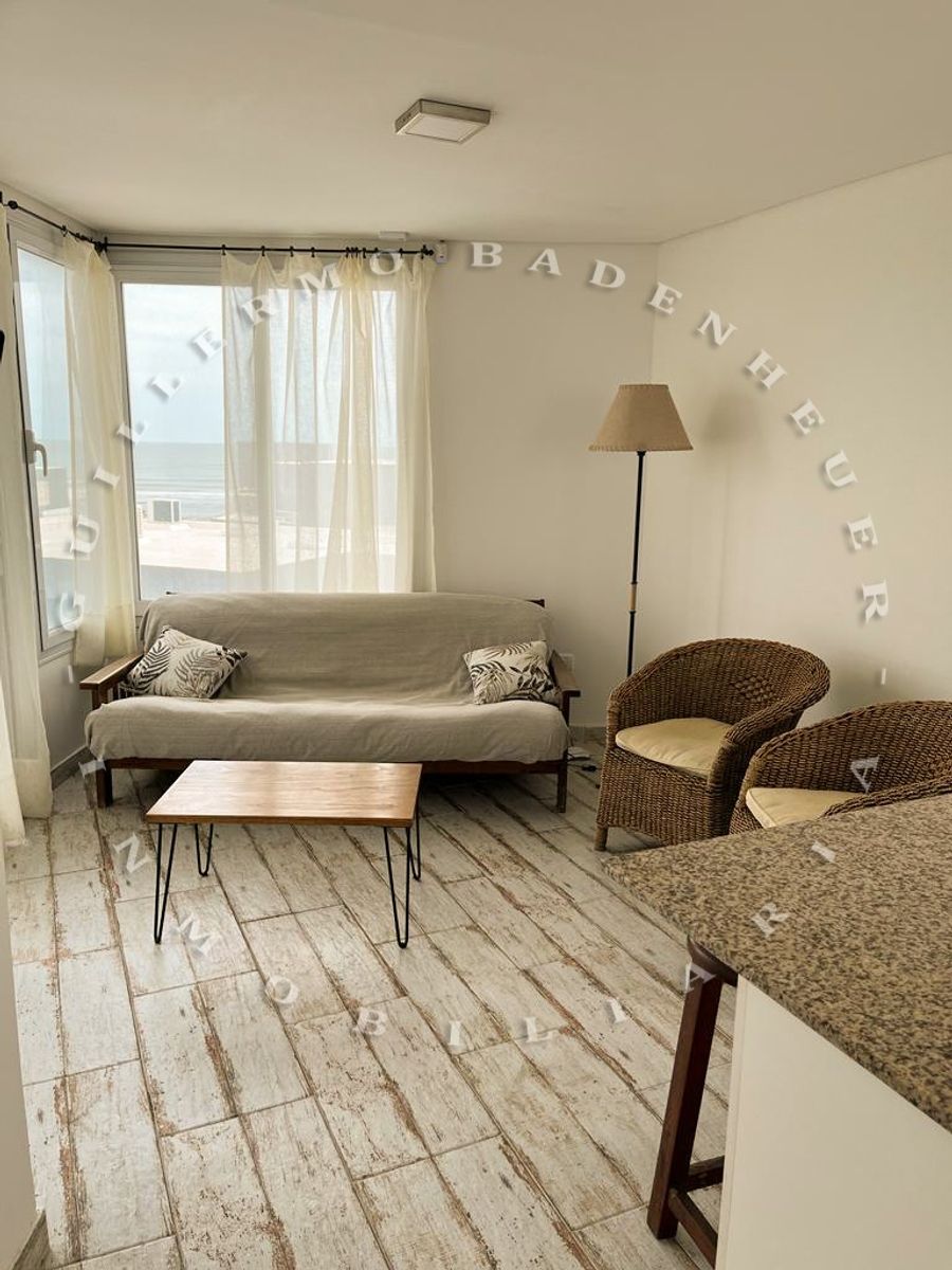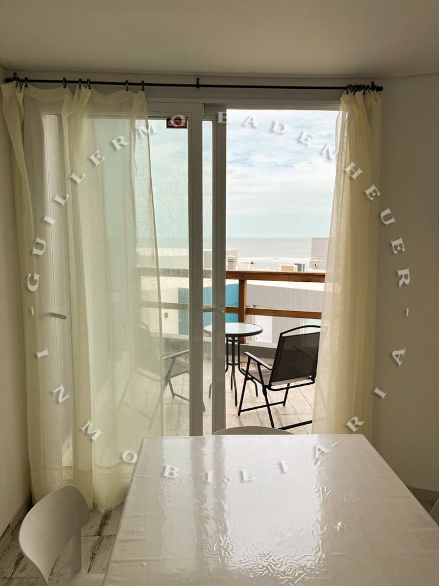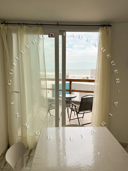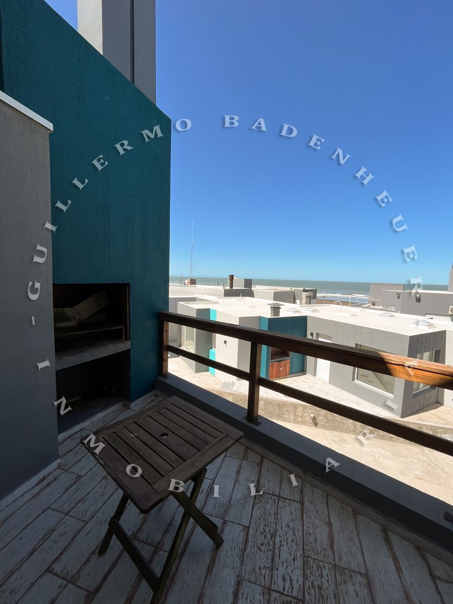 El primer piso del dúplex ofrece una entrada living/comedor de concepto abierto con vista al mar, que permite el acceso al balcón donde se encuentra la parrilla individual. La cocina posee heladera con freezer, microondas, horno, pava eléctrica junto con los distintos materiales de cocina.