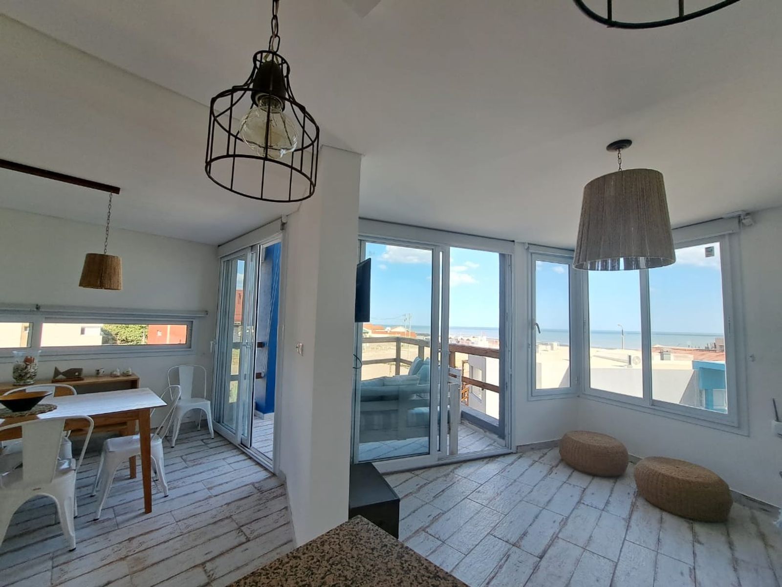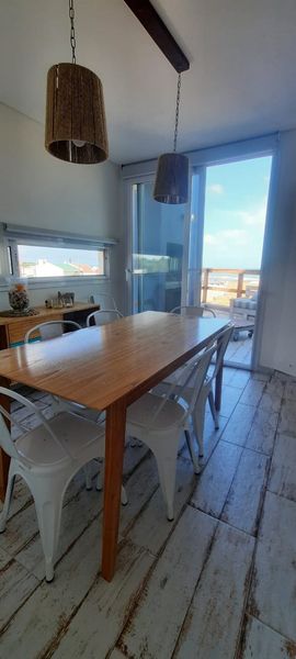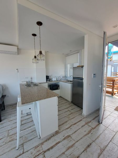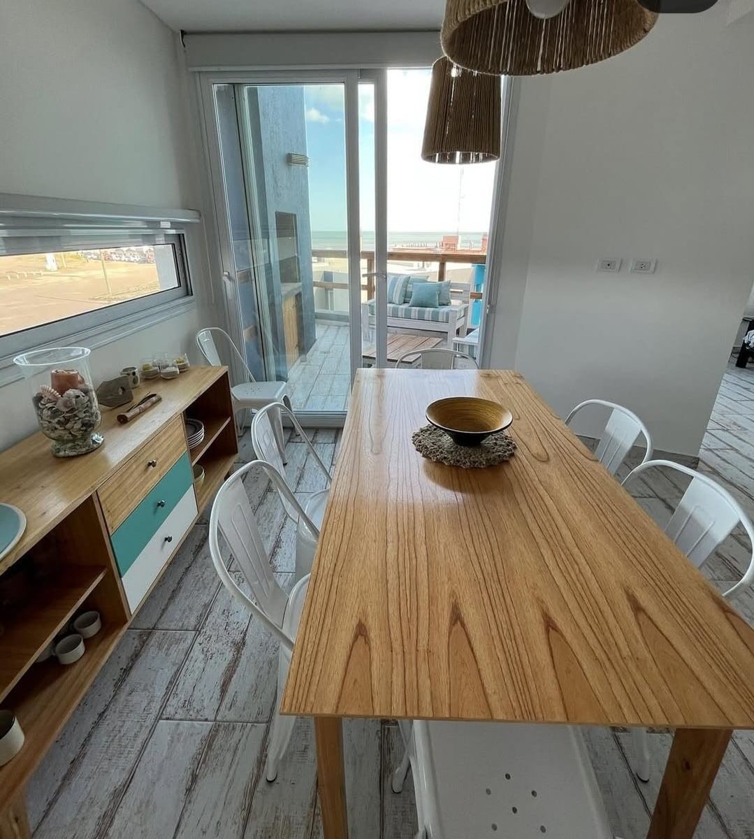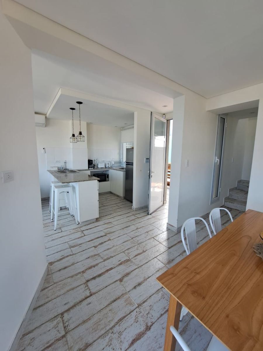 El primer piso del dúplex ofrece una entrada living/comedor de concepto abierto con vista al mar, que permite el acceso al balcón donde se encuentra la parrilla individual. La cocina posee heladera con freezer, microondas, horno eléctrico, cafetera, exprimidor, licuadora y tostadora junto con los distintos materiales de cocina.
